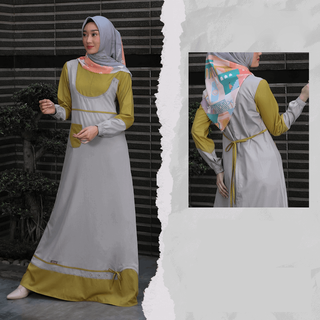 Bahan : VALDENA. Bukaan resleting dibagian depan, ujung lengan berkancing, terdapat saku disamping kanan gamis,terdapat tali hidup dibagan pinggang gamis.