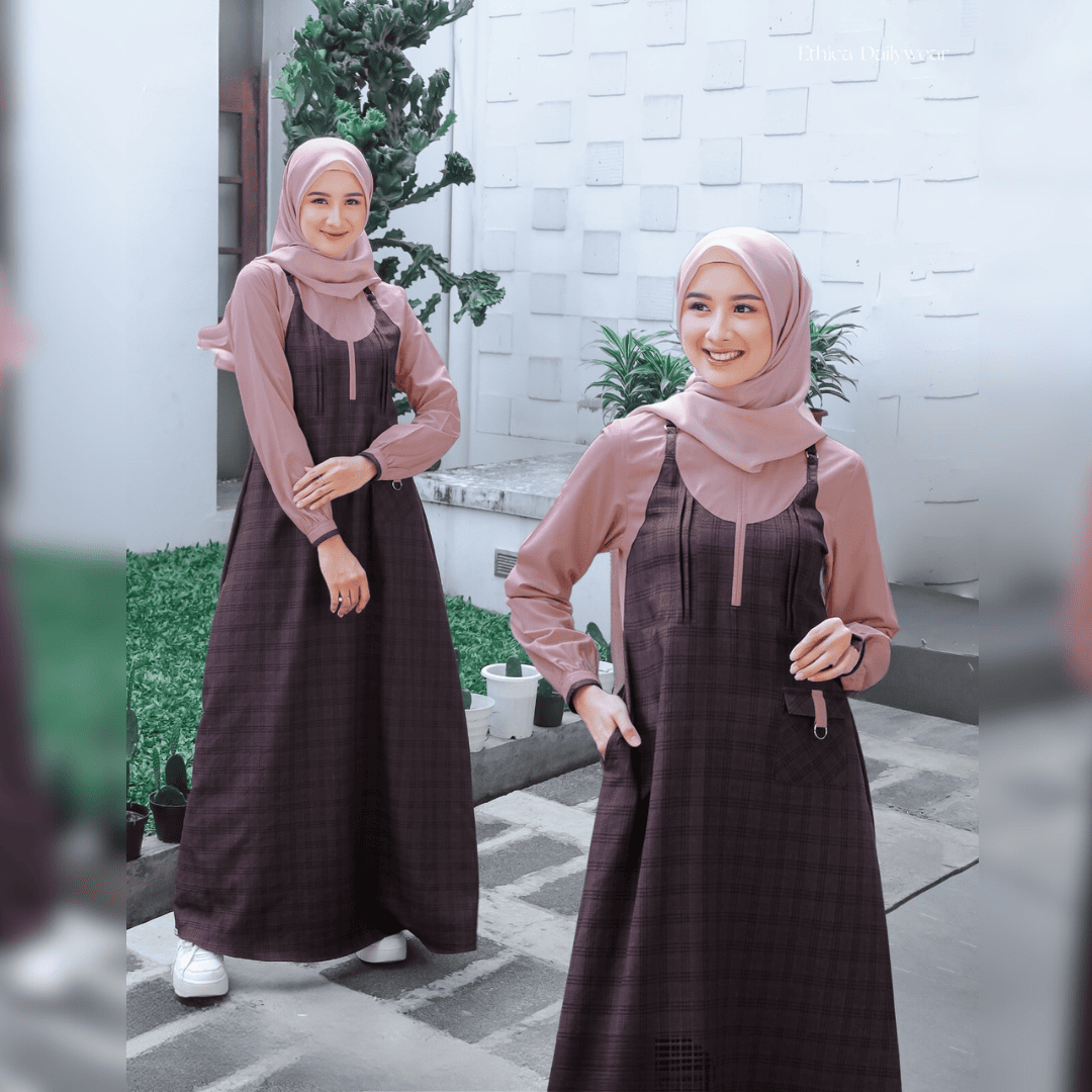 BAHAN : LINEN KOTAK + VALDENA. Bukaan resleting dibagian depan, teradapat variasi ring kecil disisi kanan dan kiri bukaan, tampilan seperti overall tapi sebenarnya dijahit menyatu, ujung lengan berkancing, terdapat saku dalam disamping kanan gamis juga saku depan sebelah kiri, serta motif kotak yang classy.