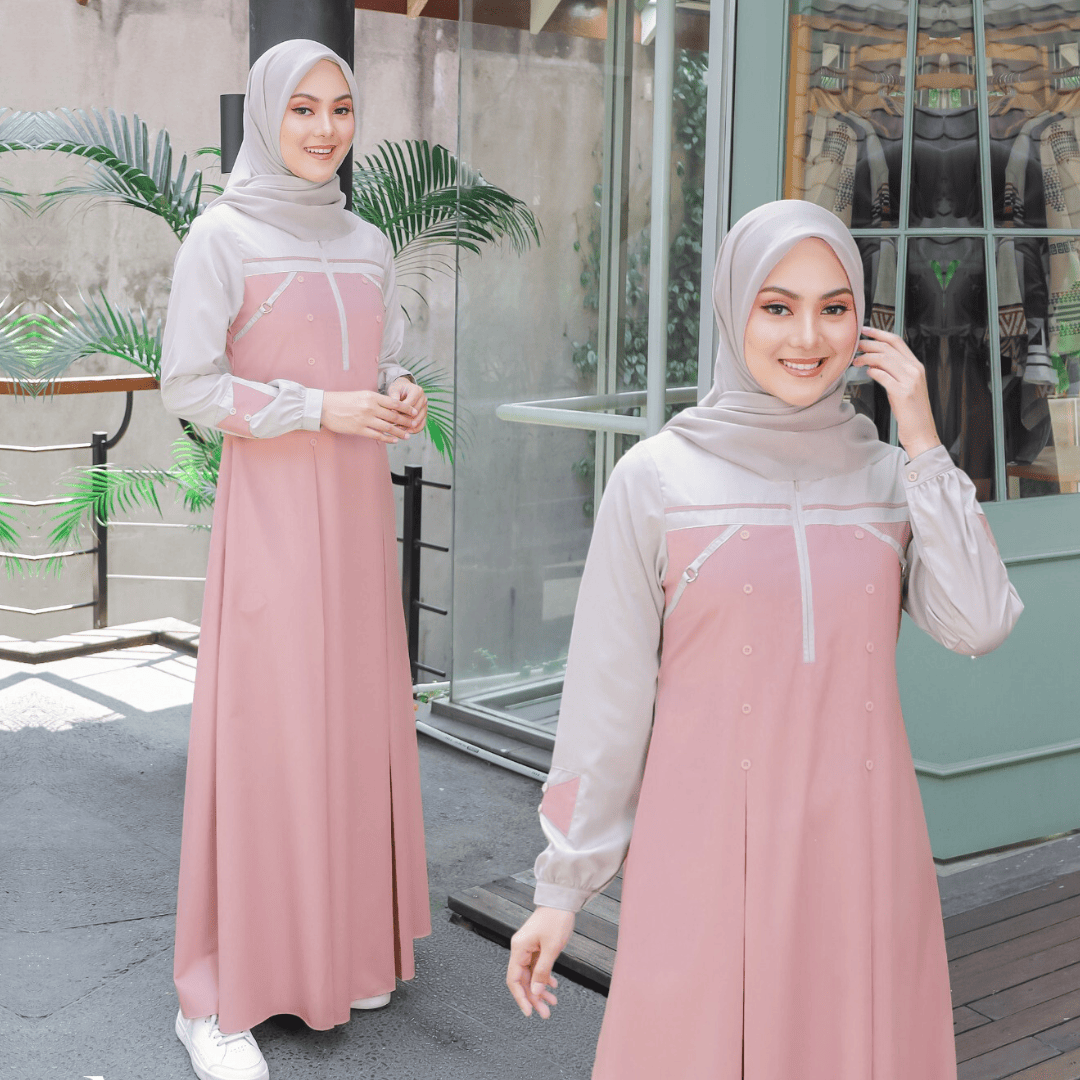 – Variasi kancing mati pada sisi kanan dan kiri gamis