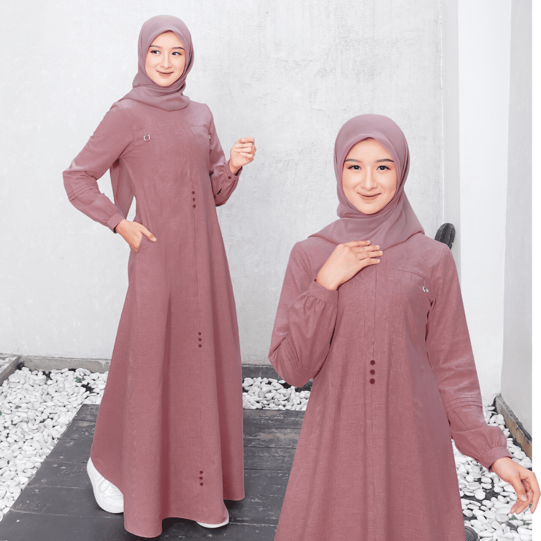 BAHAN : Katun Slub. Bukaan kancing dibagian depan, ujung lengan berkancing, di bagian belakang terdapat tali aktif, saku samping sebelah kanan, serta bagian bawah gamis kerut dan ada tambahan aksen list dan ring.