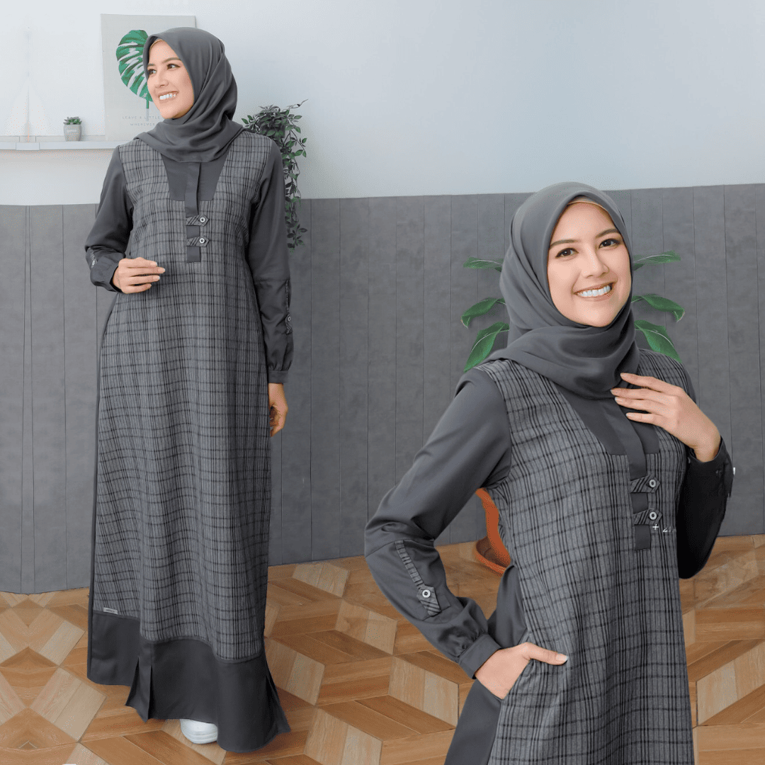 – Variasi motif kotak salur dipadu padankan dengan warna polos senada menambah kesan classy dan trendy
