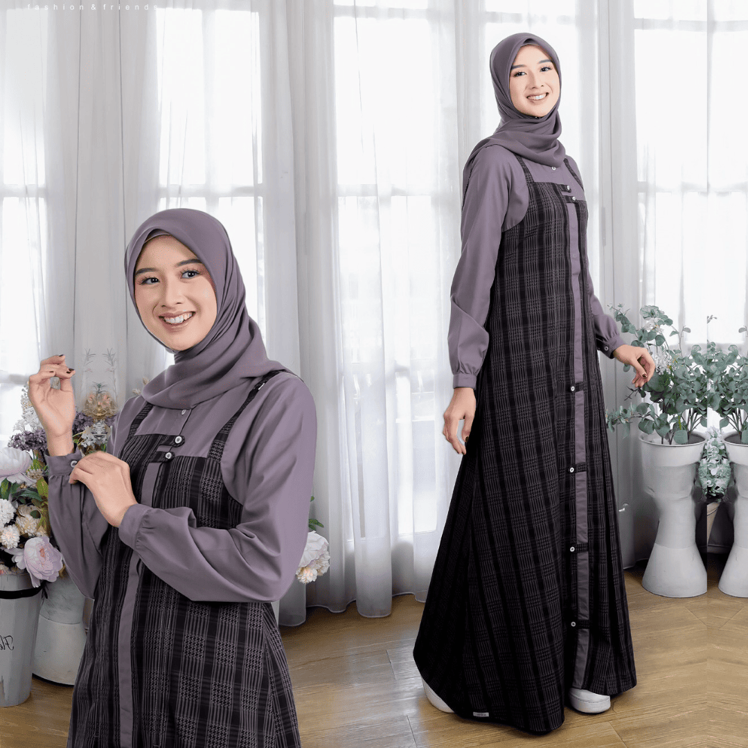 – Variasi motif kotak salur dipadu padankan dengan warna polos senada menambah kesan classy dan trendy