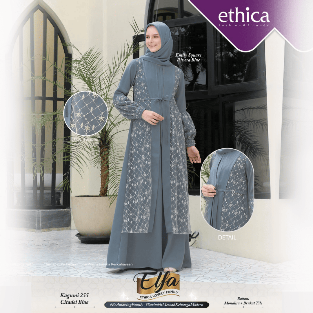Busana Gamis Pesta Ethica dengan warna Citadel Blue.