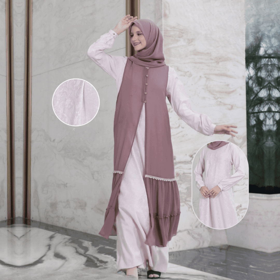 Detail Gamis : Terdapat resleting dibagian depan, ujung lengan terdapat kancing (wudhufriendly), inner dan outer terpisah. Outer variasi pita renda cantik yang menambah kesan glamour pada gamis, outer lengan kutung dengan bukaan kancing, serta terdapat saku dibagian kanan gamis dibagian inner.