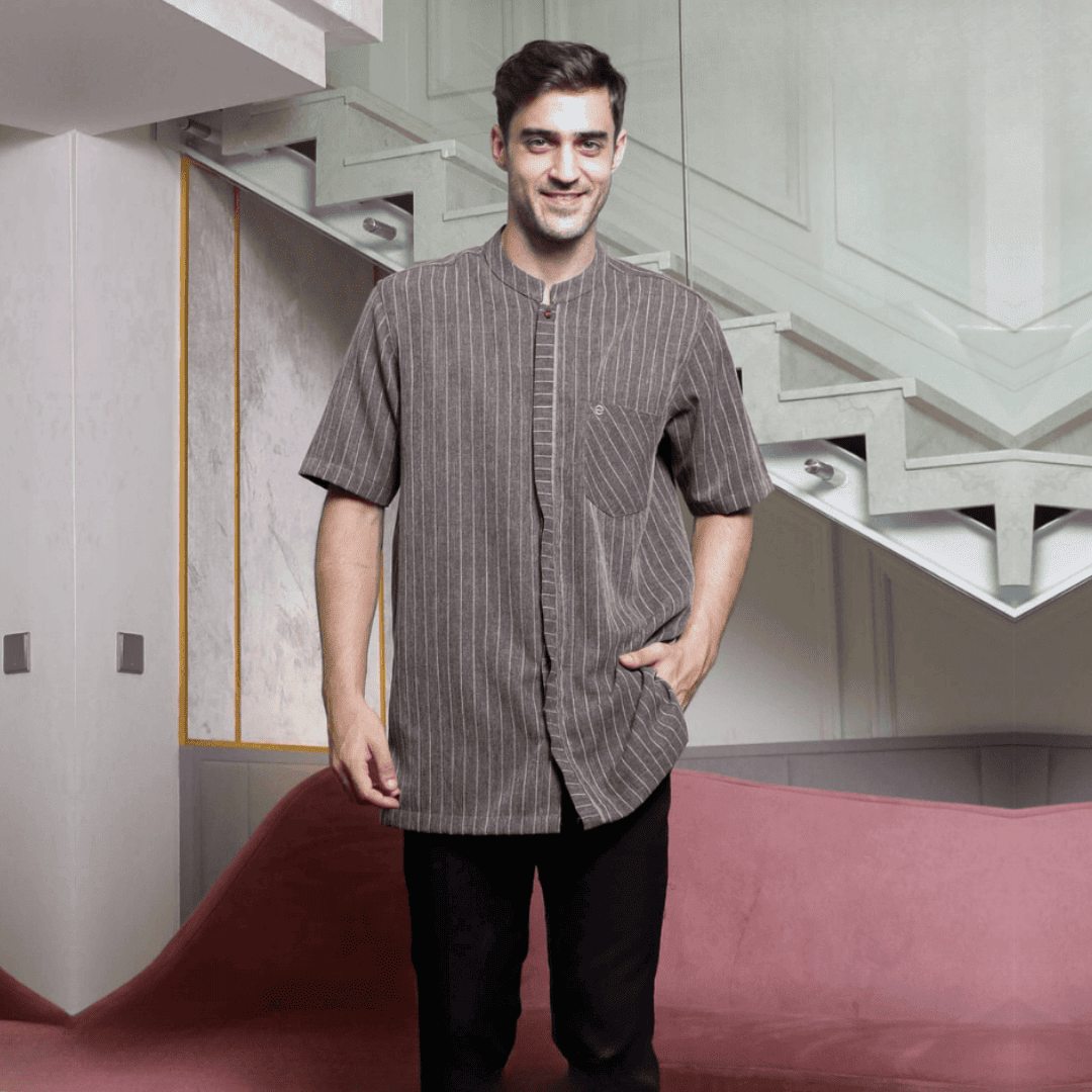 BAHAN : LINEN STRIPE + VALDENA. Kemeja lengan pendek, kancing bagian depan dengan variasi motif kekinian, dan saku bagian kiri yang bermotif.