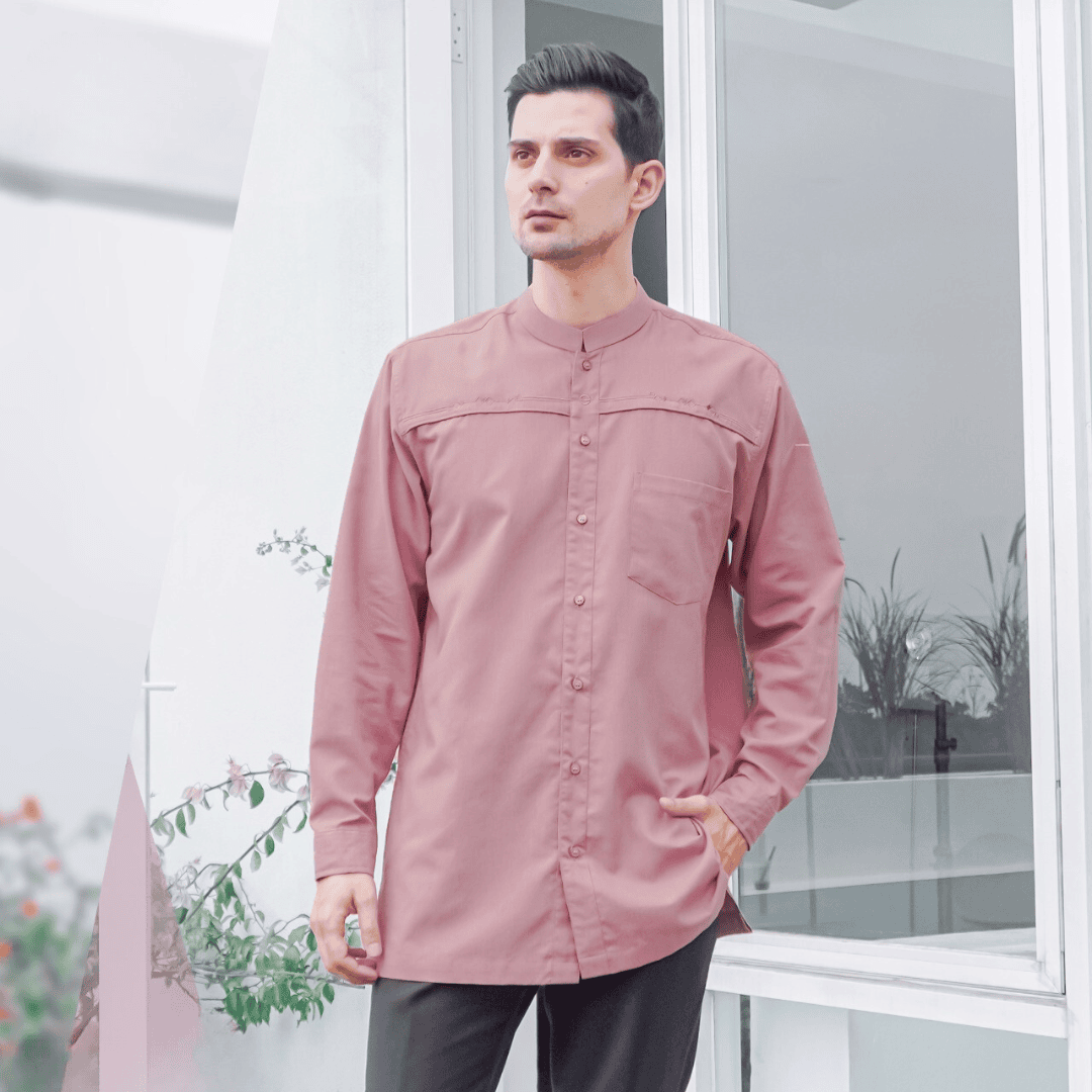 KAHFI 284 ROSE SLATE ( Koko Ayah ) – Koko lengan panjang – Bukaan plaket kancing – Kerah chiang’i – Saku tempel – Variasi list hidup horizontal dengan bordir