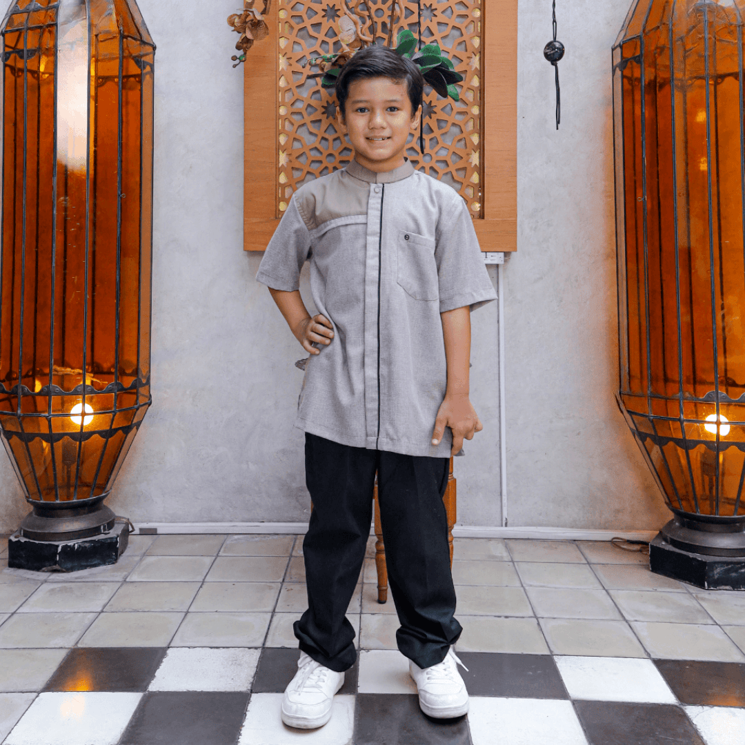KAHFI KIDS 177 STUCCO SAND ( Koko Anak ) – Koko lengan pendek – Bukaan kancing sembunyi – Kerah chiang’i – Saku tempel – Variasi list hidup dan potongan di bagian dada – Celana dengan karet pinggang – Celana dengan saku sembunyi di sisi kanan