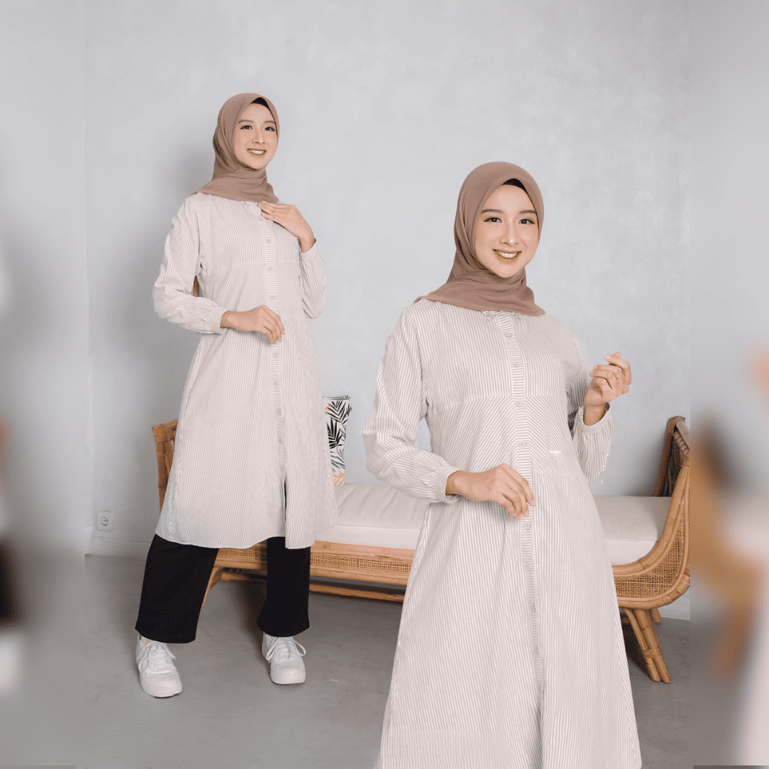Detail : Bukaan full Kancing di bagian depan (busuifriendly) dan ujung pergelangan tangan (wudhufriendly), terdapat aksen kerah serta motif salur yang menambah kesan modis dan trendy.