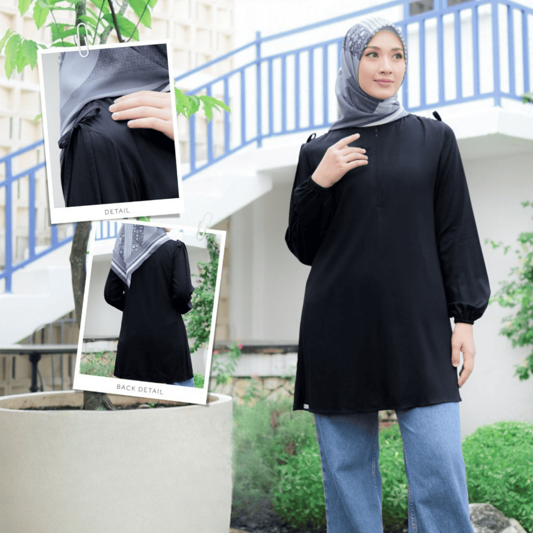 =>> PRODUCT DETAIL : – Atasan dengan bukaan depan menggunakan zipper setengah badan dan kerah chiang’i – Variasi serut dengan tali pada bagian bahu – Lengan menggunakan karet