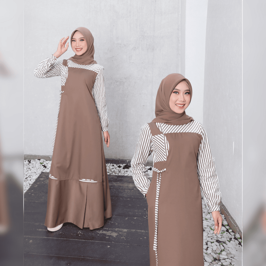 BAHAN : VALDENA+STRIP LADY. Bukaan resleting dibagian depan dengan kombinasi kancing mati, ujung lengan berkancing, terdapat saku disamping kanan gamis, juga tali pinggang dibagian belakang, serta variasi motif salur yang makin bikin trendy.