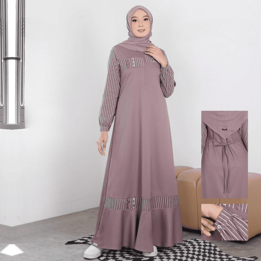 – Variasi frill dan kancing pada bagian kombinasi di dada