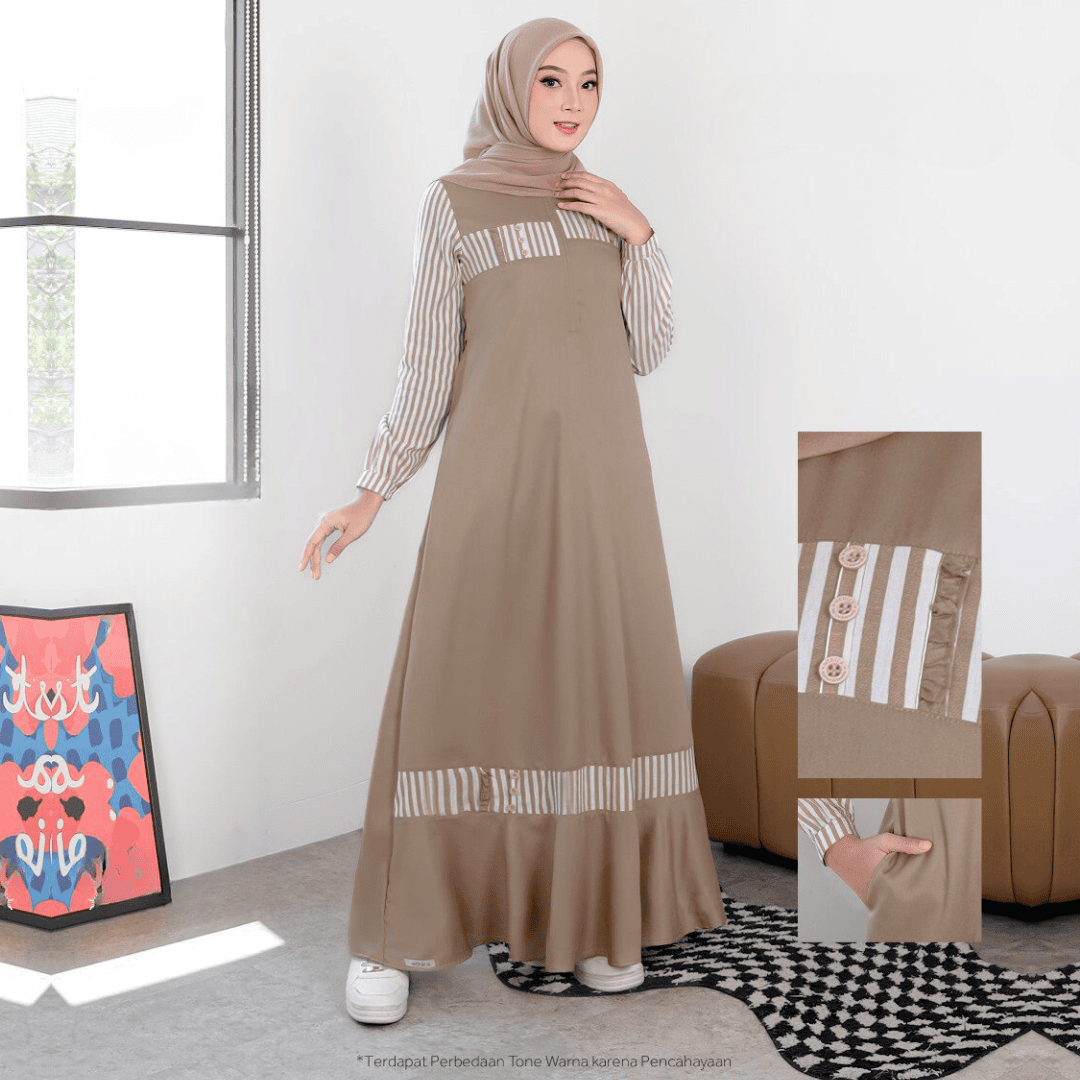 – Variasi frill dan kancing pada bagian kombinasi di dada